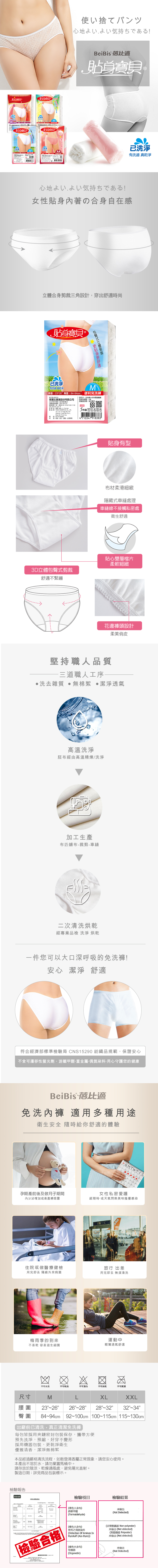 ★時尚服貼身形不鬆垮、美麗有自信★貼心綿檔片處理,超柔肌觸無壓力★ 出廠前已清洗,真正清潔免洗褲★3D立體包臀式剪裁設計,舒適不緊繃★女性定期更換內著必備,保護私密處減少感染